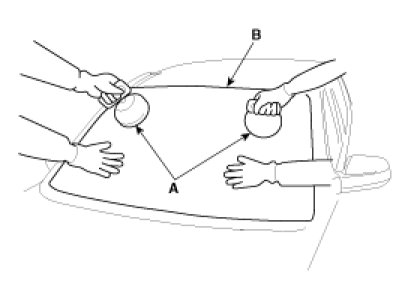 9. Use suction cups (A) to hold the windshield over the opening, align it with the alignment marks (B) made in step 15, and set it down on the adhesive. Lightly push on the windshield until its edges are fully seated on the adhesive all the way around. Do not open or close the doors until the adhesive is dry.