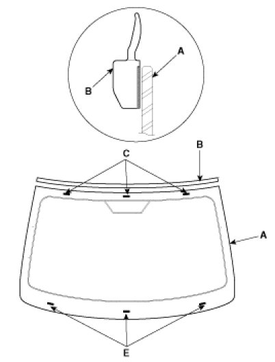 4. Install the spacer (A) install the windshield glass (B) temporarily with marking sure to position them on the center, and then place the alignment mark (C).