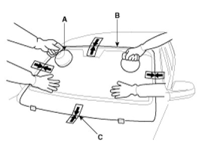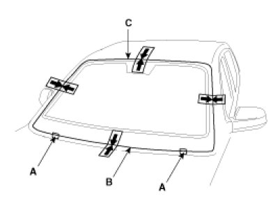 3. Install the windshield (A) upper molding (B) and fasteners (C). Do not allow any gaps.