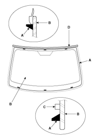 8. Pack adhesive into the cartridge without air pockets to ensure continuous delivery. Put the cartridge in a caulking gun, and run a bead of adhesive (A) around the edge of the windshield (B) between the fastener (C) and molding (D) as shown. Apply the adhesive within 30 minutes after applying the glass primer.