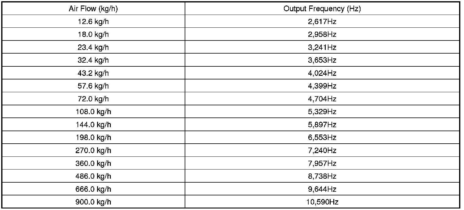 Mass Air Flow Sensor (MAFS) is a hot-film type sensor and is located in between the air cleaner and the throttle body. It consists of a tube, a sensor assembly and honeycomb cell and detects intake air quantity flowing into the intake manifold. Air flows from the air cleaner assembly through the honeycomb cell and over the hot film element. At this time, heat transfer is generated by convection and this sensor loses its energy. This sensor detects the mass air flow by using the energy loss and transfers the information to the PCM by frequency. The PCM calculates fuel quantity and ignition timing.