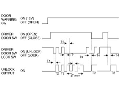 If the T Unlock signal is received within T2, the Unlock output shall be ON to all doors for T1. (After the driver door Key Unlock switch is turn to ON from OFF, if the same condition is satisfied within T2, then the Unlock output shall be ON to all doors.)