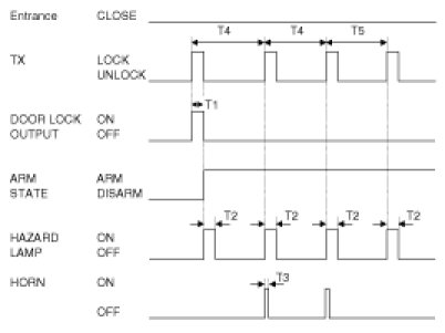 (1) In the state that the door is Locked by TX(alarm state), if Tx Lock signal is received again within 4sec after the last Tx Lock signal is received, Horn shall be output at one time (0.05 sec)