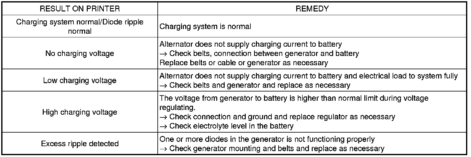 6. Take a relevant action according to the test results by referring to the table below after shutting off the engine and disconnect the tester clamps from the battery.