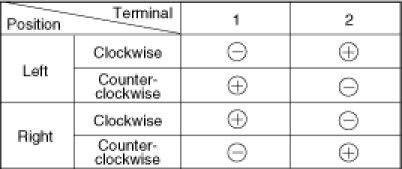 3. Connect the motor terminals directly to battery voltage (12V) and check that the motor operates smoothly. Next, reverse the polarity and check that the motor operates smoothly in the reverse direction. If the operation is abnormal, replace the motor.