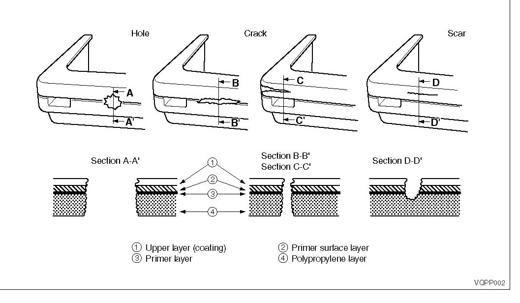 Damage to the bumper that reaches the surface of the polypropylene cannot be fixed just by painting. Use the repair methods shown below to repair damage that reaches the surface of the polypropylene.