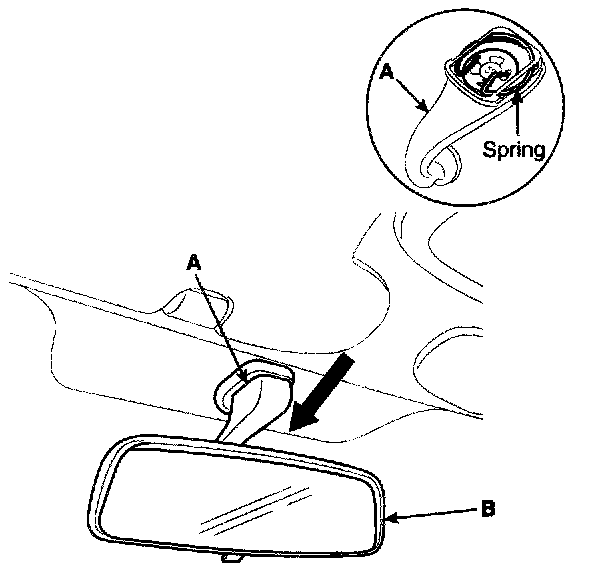 Push the inside rear view mirror base (A) down to wards the inside rear view mirror assembly (B).