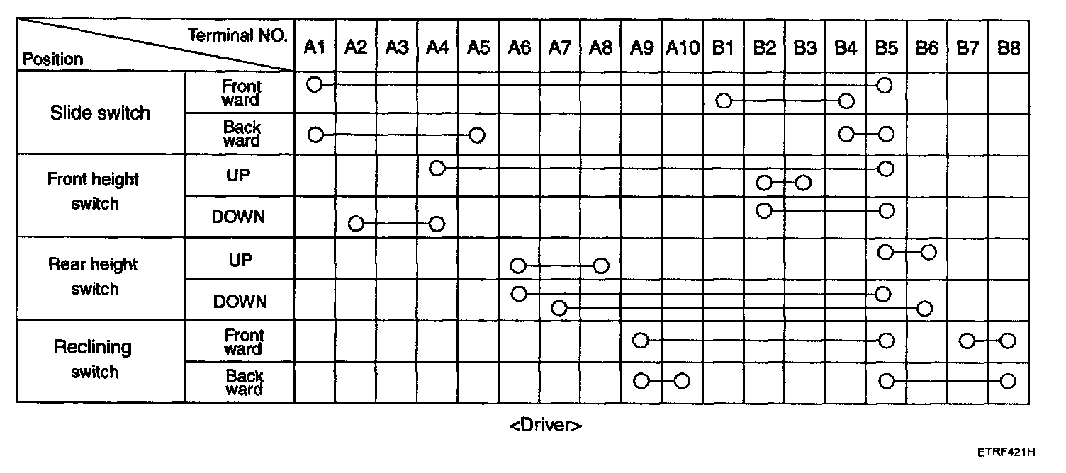 in each position, make sure that continuity exists between the terminals below. If continuity is not as specified, replace the power seat switch.