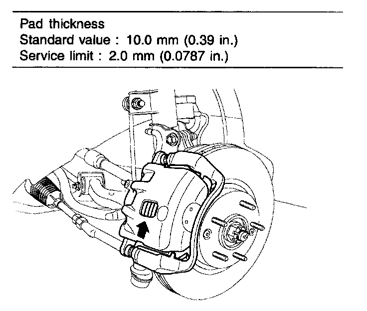 ^ If the pad lining thickness is out of specification, left and right pads must be replaced as a complete set.