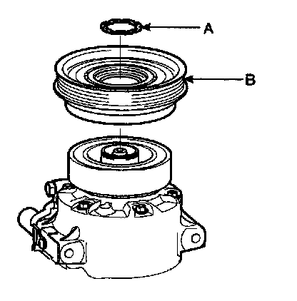 - Be careful not to damage the pulley (B) and compressor during removal/installation.