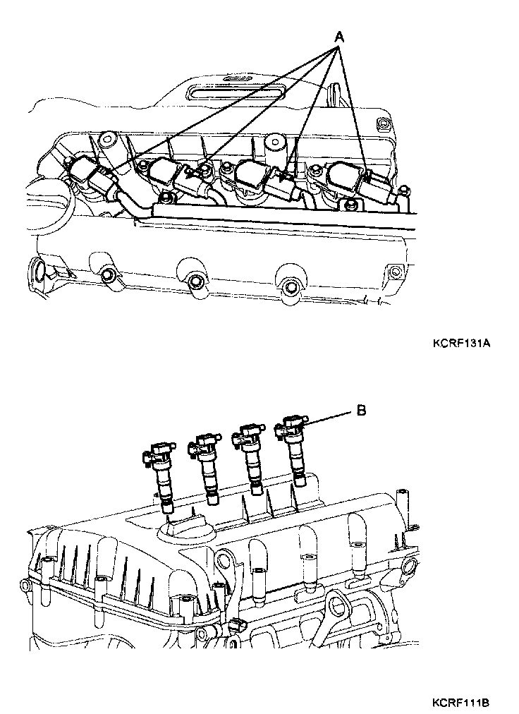 2. Remove ignition coil connectors(A), ignition coils(B).