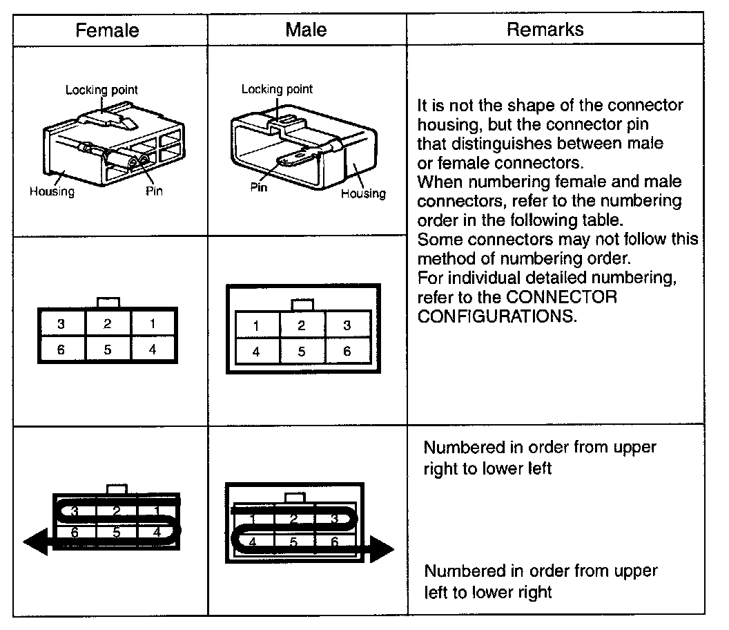 - The "Connector Configurations" identifies connectors that are used to join harnesses together; junction connectors for common power and ground wires are also identified. Male and female connector views are shown applicable.