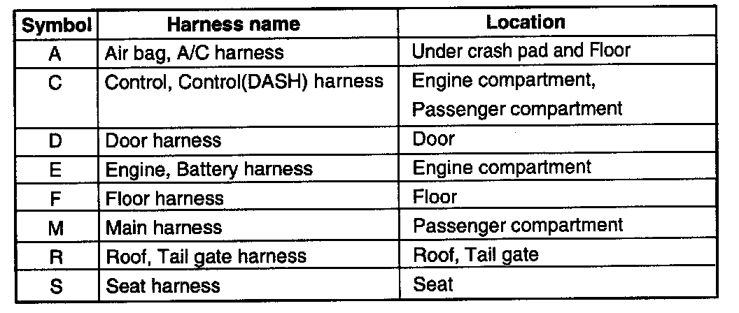 NOTE Connectors which connect each wiring harness are represented by the given symbols.