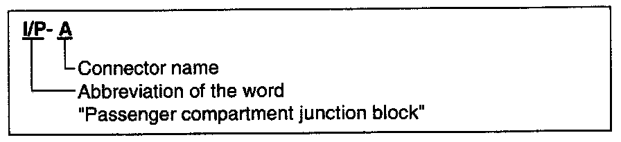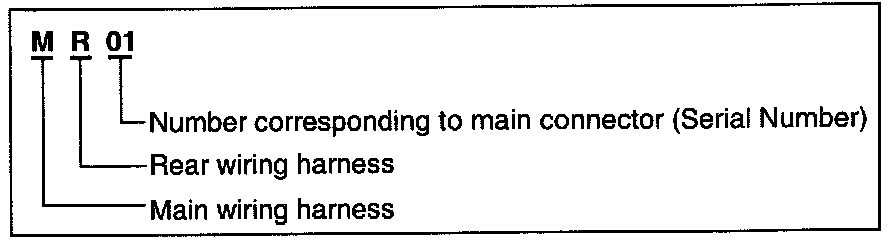 A connector identification symbol consists of a wiring harness location classification symbol corresponding to a wiring harness location and number corresponding to the connector.