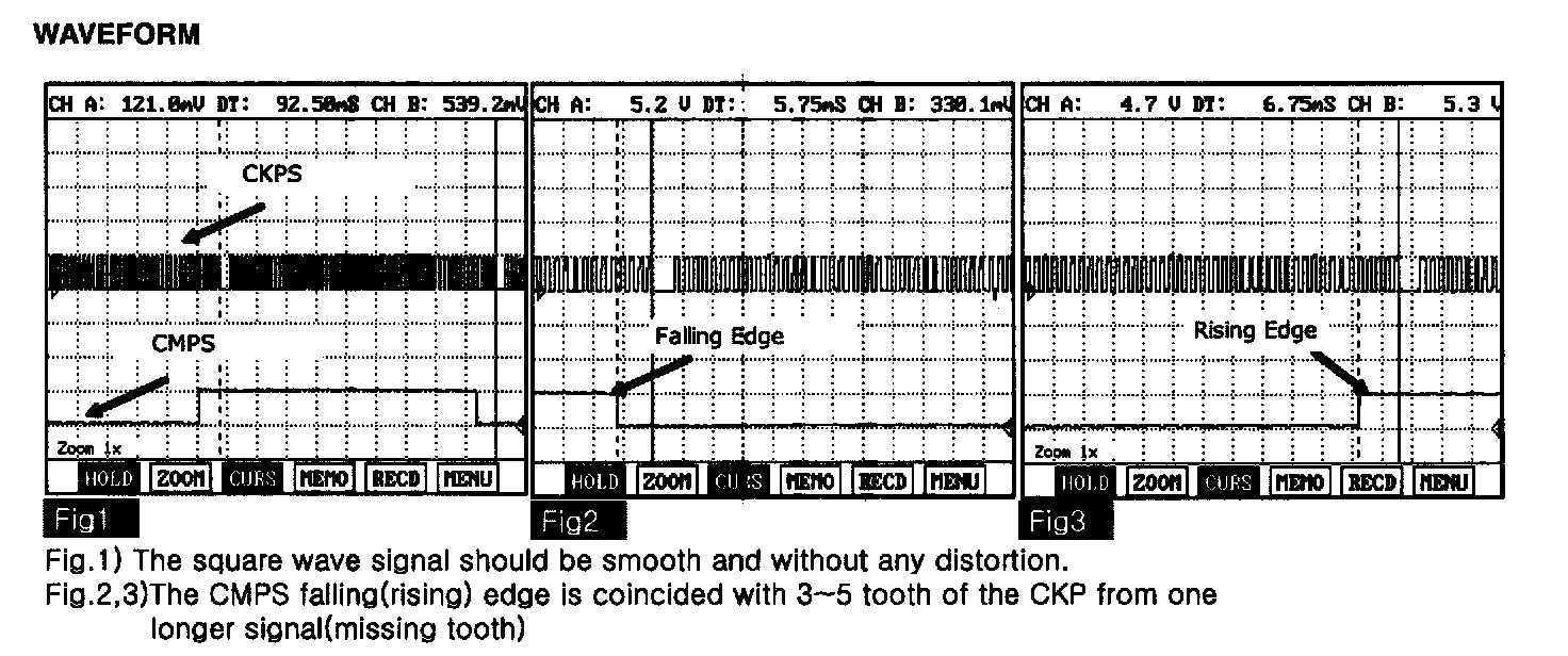 Camshaft Position Sensor (CMPS) is a hall sensor and detects the camshaft position by using a hat element. It is related with Crankshaft Position Sensor (CKPS) and detects the piston position of each cylinder which the CKPS can't detect. The CMPS are installed on engine head cover and uses a target wheel installed on the camshaft. This sensor has a hall-effect IC which output voltage changes when magnetic field is made on the IC with current flow.