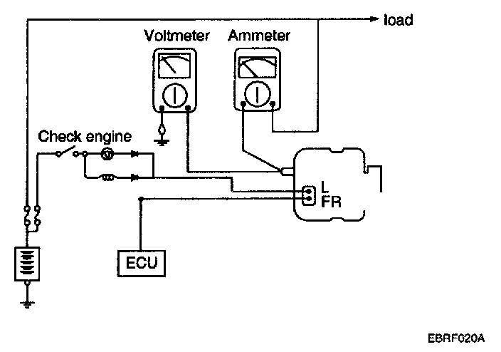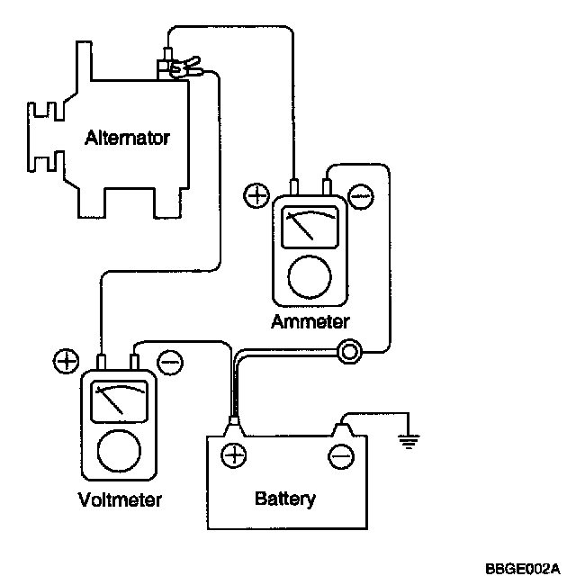 1. Check to see that the voltmeter reads as the same value as the battery voltage. If the voltmeter reads 0 V, and the open circuit in the wire between alternator "B" terminal and battery (-) terminal or poor grounding is suspected.