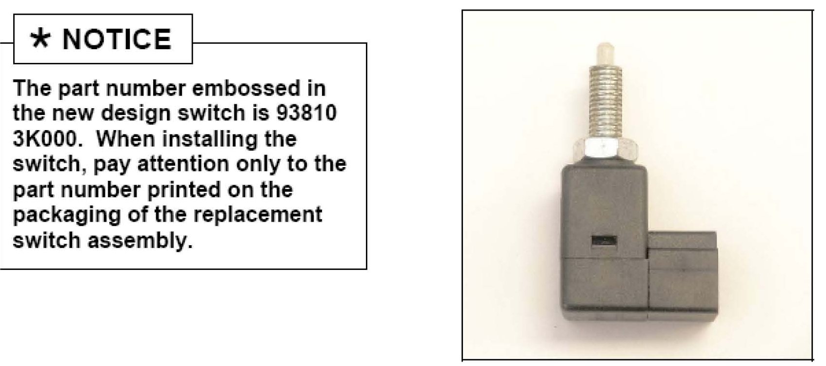 4. Install new stop lamp switch part number 93810 3K400QQK with gray colored body and connector.