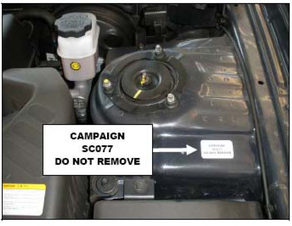 Attach campaign completion sticker SC077 to the driver's side strut tower as shown here.