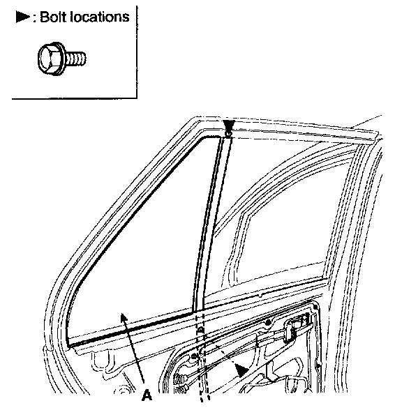 3. After loosening the mounting bolt and screw, then remove the quarter glass assembly (A).
