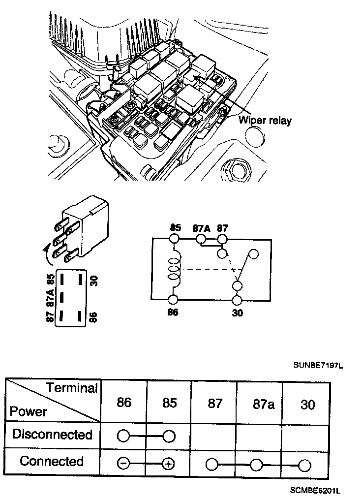 1. There should be continuity between the No.87 terminal and No.30 terminal in the wiper relay when power and ground are connected to the No.86 terminal and No.85 terminal.