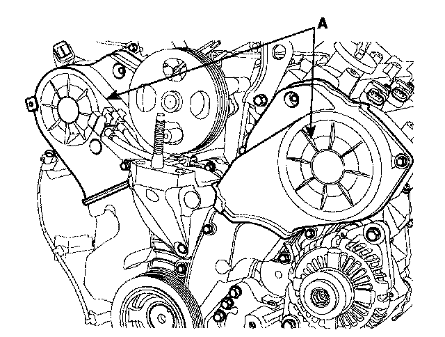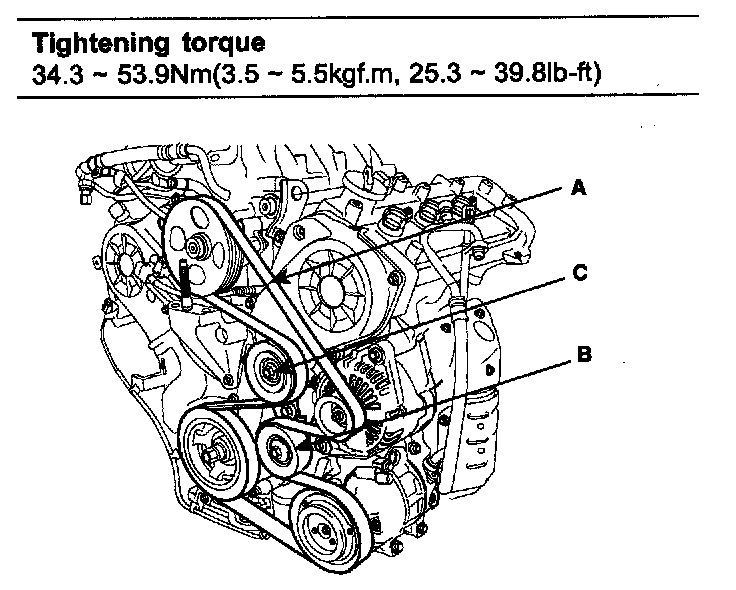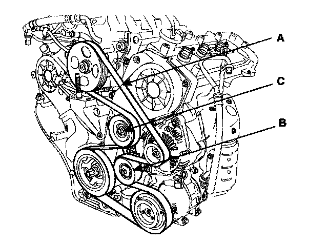 4. Remove the drive belt(A), the idler(B) and the tensioner(C).
