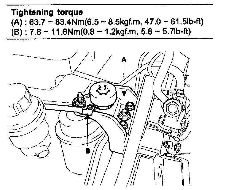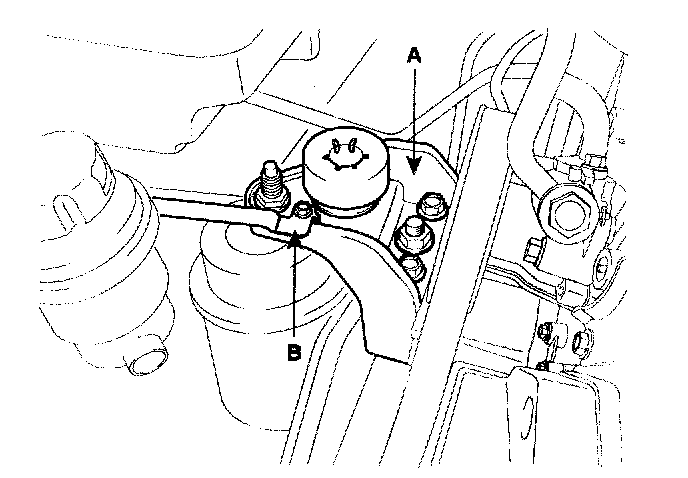 2) Remove the engine mounting bracket(A) and the ground cable(B).
