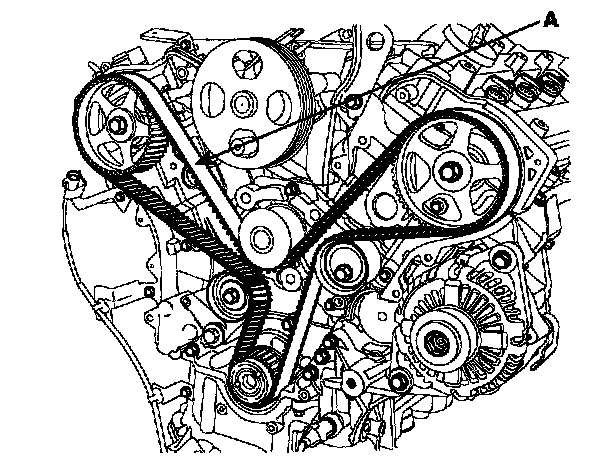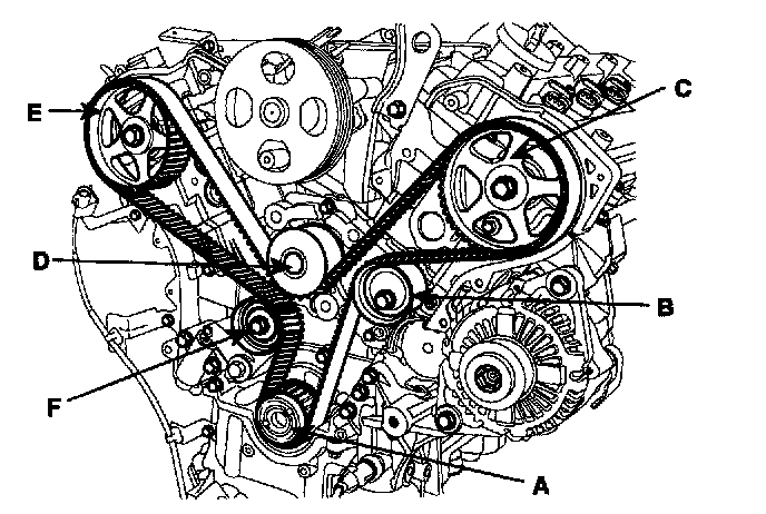 Crankshaft sprocket(A) Idler(B) -> Bank 2 exhaust camsprocket(C) -> Water pump pulley(D) -> Bank 1 exhaust camsprocket(E) -> Tensioner pulley(F).