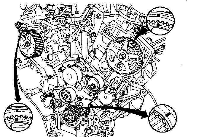 4. Verify the alignment of the timing marks on the camshaft and the crankshaft sprockets.