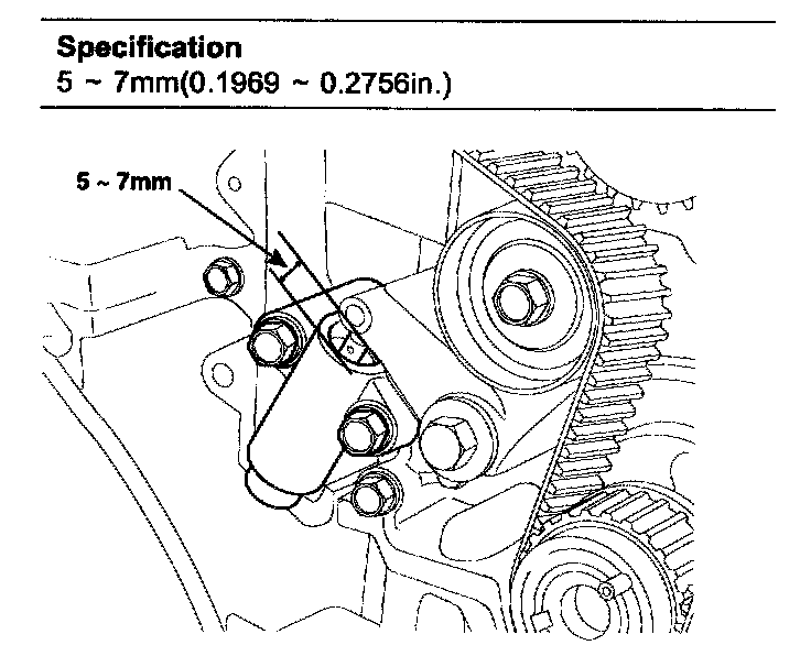 6. Align the groove of the pulley with the timing mark of the timing belt cover by turning the crankshaft pulley clockwise. Check if the timing mark of the camshaft sprocket is aligned with that of the cylinder head cover.