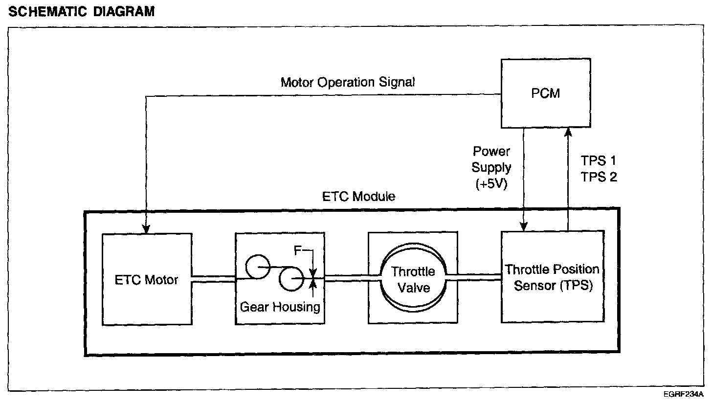 ETC (Electronic Throttle Control) system is electronically controlled throttle device which controls the throttle valve. It consists of ETC motor, throttle body and throttle position sensor (TPS). A mechanical throttle control system receives a driver's intention via a wire cable between the accelerator and the throttle valve, while this ETC system does the signal from the Accelerator Position Sensor (APS) installed on the accelerator pedal. After the PCM receives the APS signal and calculates the throttle opening angle, it activates the throttle valve by using the ETC motor. Additionally, it can materialize cruise control function without any special devices.
