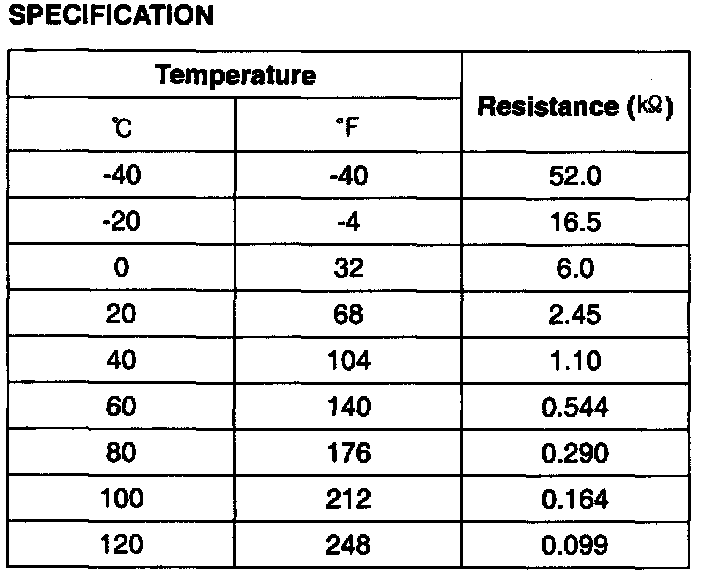 4. After immersing the thermistor of the sensor into water (or engine coolant), measure resistance between OTS terminals 1 and 2.