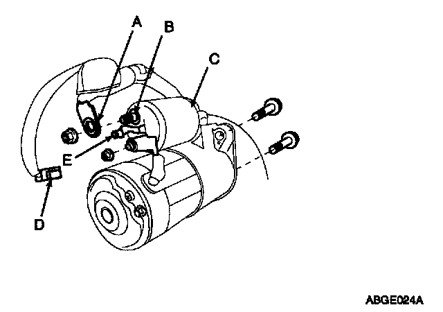 2. Disconnect the starter cable (A) from the B terminal (B) on the solenoid (C), then disconnect the connector (D) from the S terminal (E).