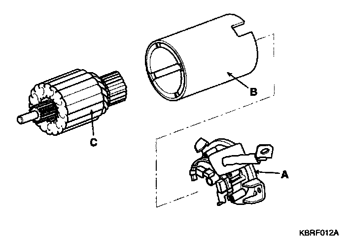 4. Remove the brush holder assembly (A), yoke (B) and armature (C).