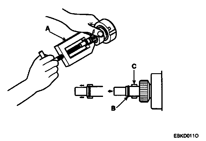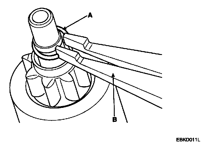 NOTE: Using a suitable pulling tool (A), pull the overrunning clutch stop ring (B) over the stopper (C).