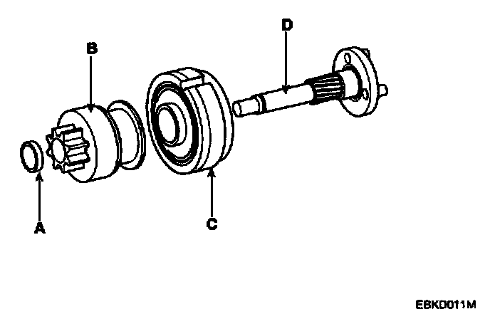 11. Disconnect the stop ring (A), overrunning clutch (B), internal gear (C) and planet shaft (D).