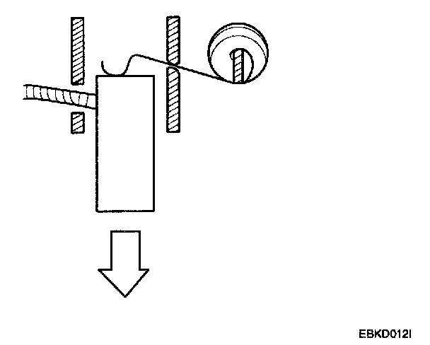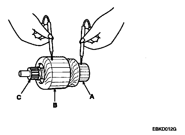 8. Check with an ohmmeter that no continuity exists between the commutator (A) and armature coil core (B), and between the commutator and armature shaft (C). If continuity exists, replace the armature.