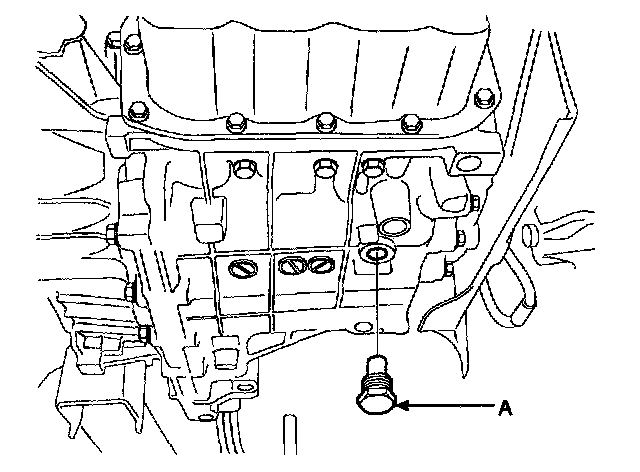 3. Remove the drain plug(A) from the bottom of the transmission case to drain the fluid.