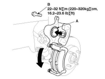 5. Pivot the caliper down into position. Being careful not to damage the pin boot, install the guide rod bolt (B) and torque it to proper specification.