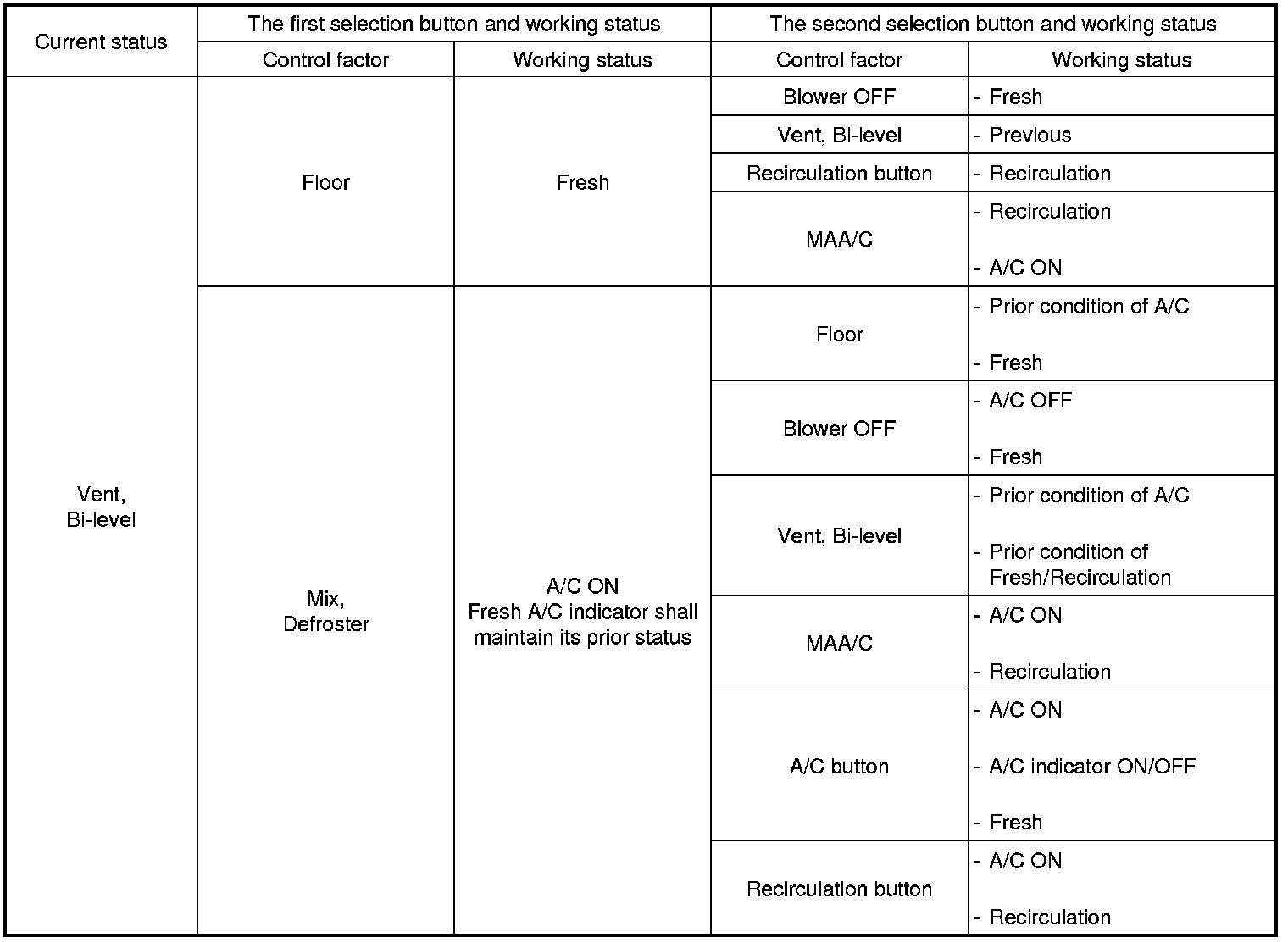(1) When defroster or mix selected, A/C ON, A/C select and A/C output signal are ON, the A/C indicator shall maintain its prior status, working in the fresh mode to help defrost.