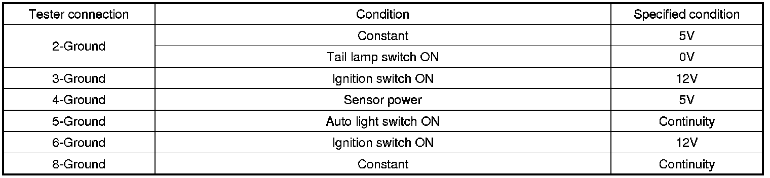 2. Disconnect the 8P connector (B) from the auto light unit then inspect the connector on the wire harness side, as shown in the chart.