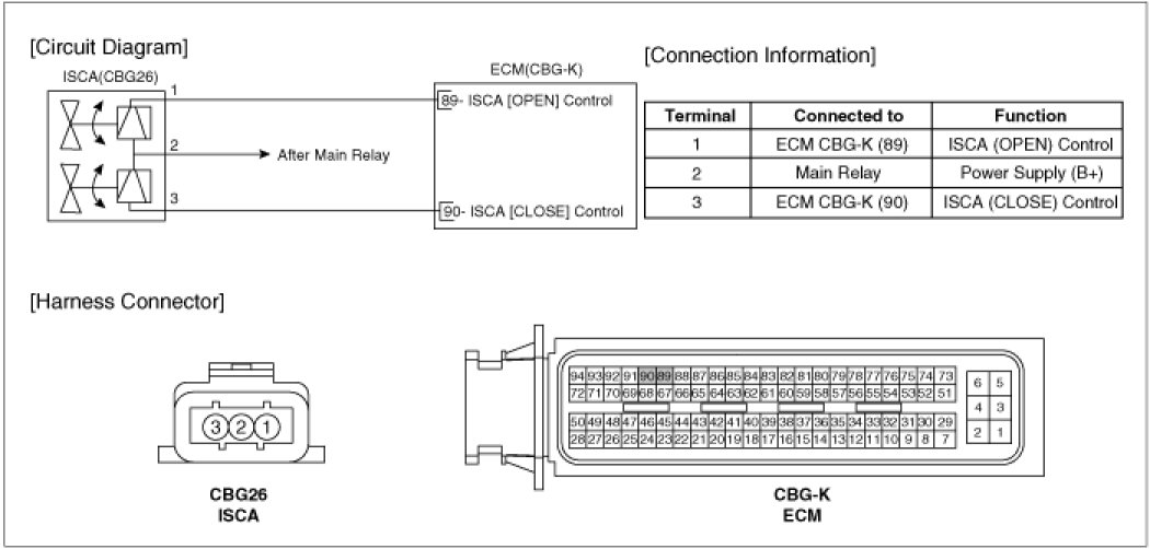 The Idle Speed Control Actuator (ISCA) is installed on the throttle body and controls the intake airflow that is bypassed around the throttle plate to keep constant engine speed when the throttle valve is closed. The function of the ISCA is to maintain idle speed according to various engine loads and conditions, and also to provide additional air during starting. The ISCA consists of an opening coil, a closing coil, and a permanent magnet. Based on information from various sensors, the ECM controls both coils by grounding their control circuits. According to the control signals from the ECM, the valve rotor rotates to control the by pass airflow into the engine.