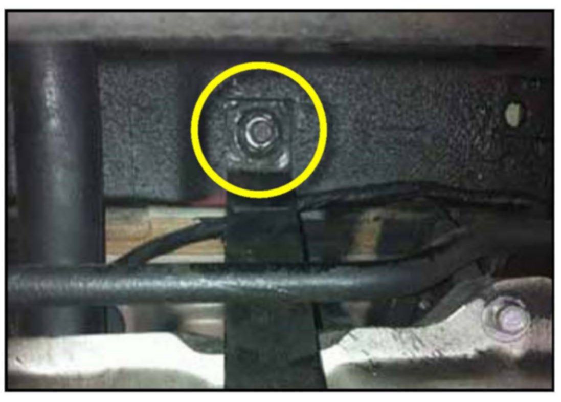 3. Remove the left-hand side fuel tank strap 14 mm hex mounting nut (4-Door) / bolt (5-Door) and then remove the left-hand side fuel tank strap.