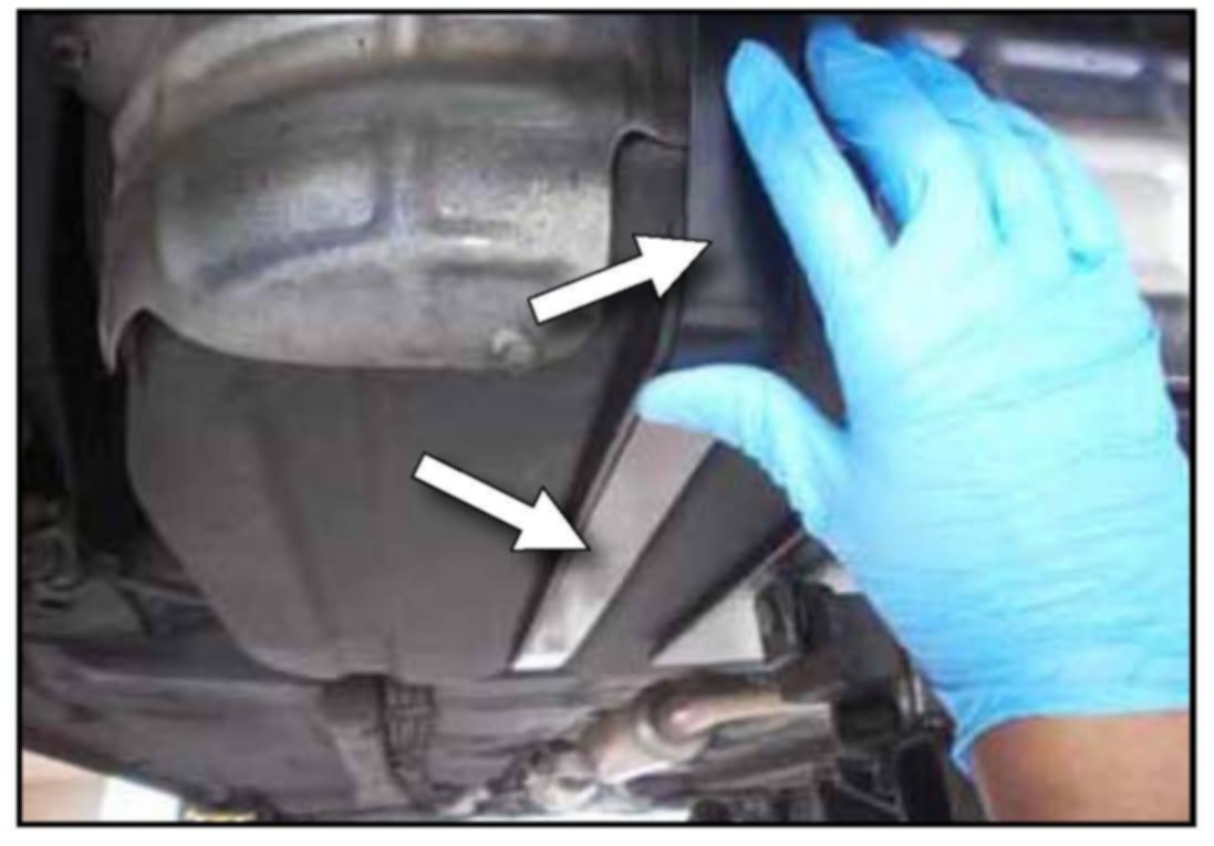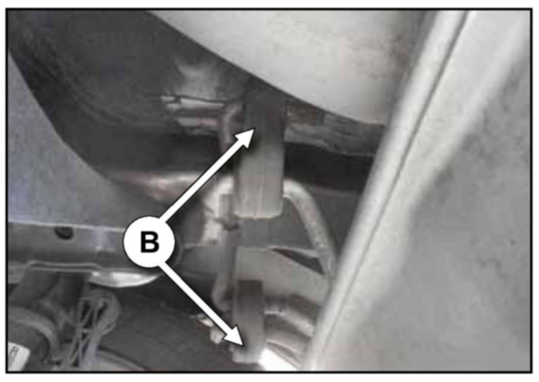 7. After the exhaust hangers have been removed, carefully push the exhaust pipe aside to avoid interference with right-hand side fuel tank strap.