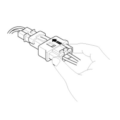1. To reconnect, hold the pawl-side connector half, and press on the back of the sleeve-side connector half in the direction shown. As the two connector halves are pressed together, the sleeve (A) is pushed back by the pawl (C). Do not touch the sleeve.