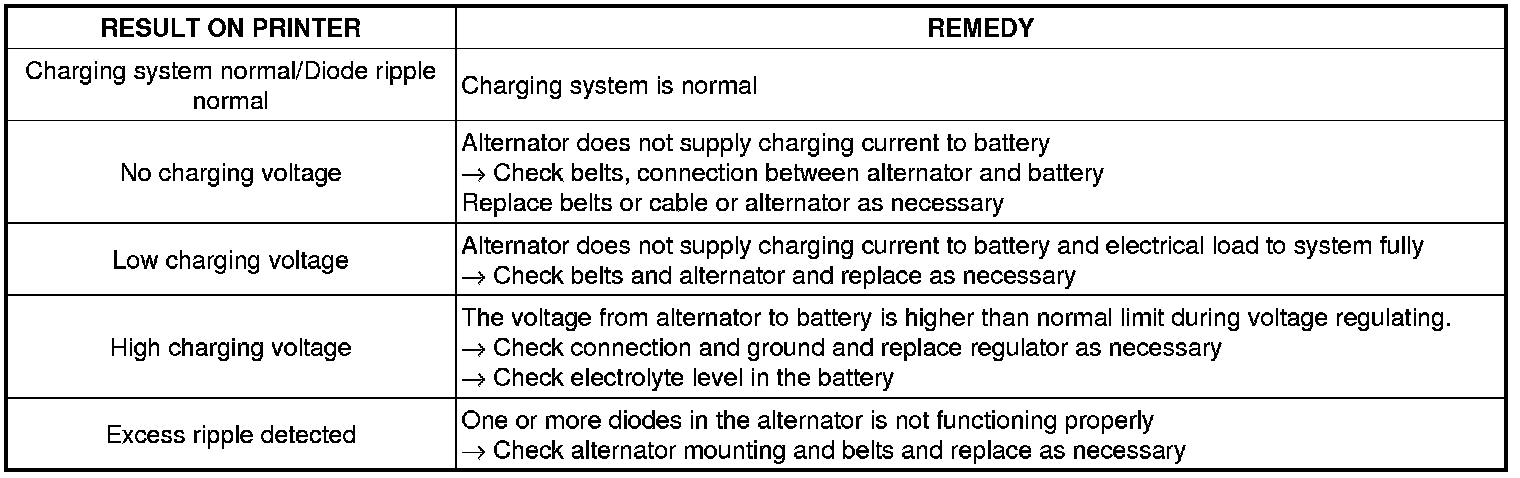 6. Take a relevant action according to the test results by referring to the table below after shutting off the engine and disconnect the tester clamps from the battery.