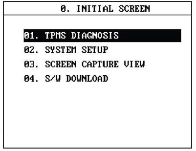INITIAL SCREEN FUNCTIONS:01. TPMS DIAGNOSIS provides access to sensor and ECU related functions.