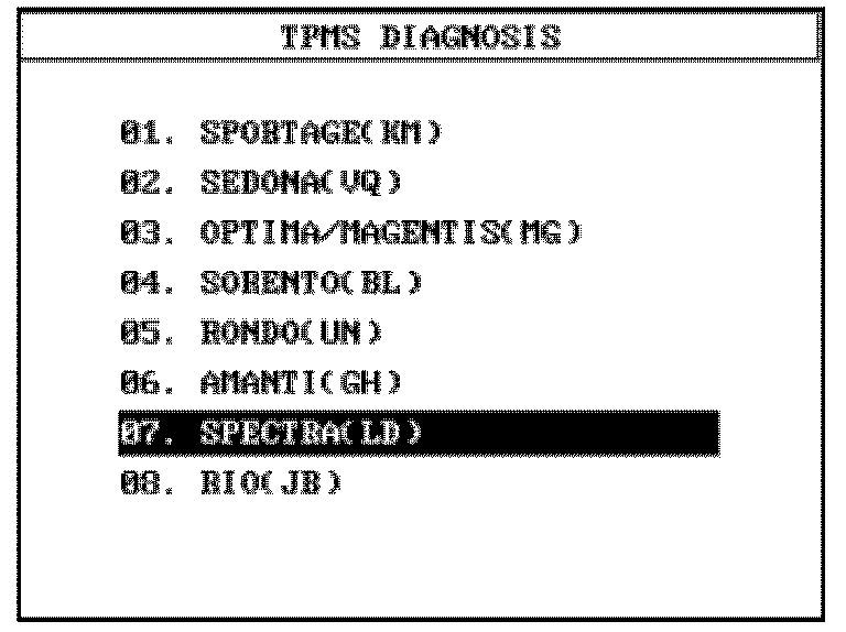 1. After selecting "01. TPMS DIAGNOSIS" from the Initial Screen, select the desired vehicle and press ENTER.