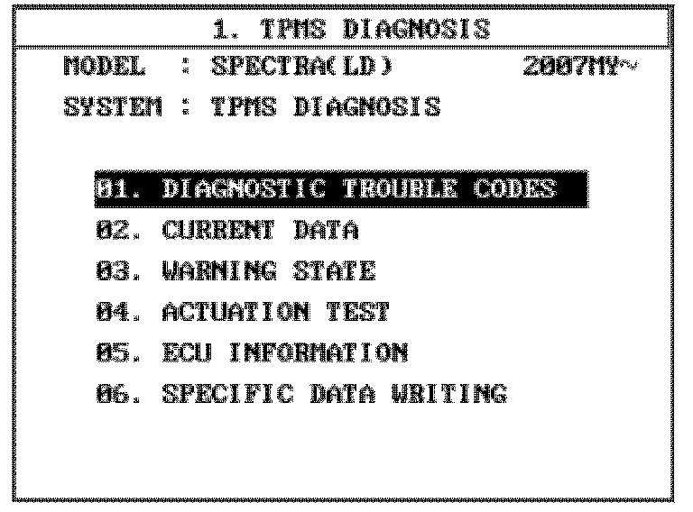 01. DIAGNOSTIC TROUBLE CODES allows the user to retrieve and clear TPMS Diagnostic trouble Codes (DTCs).