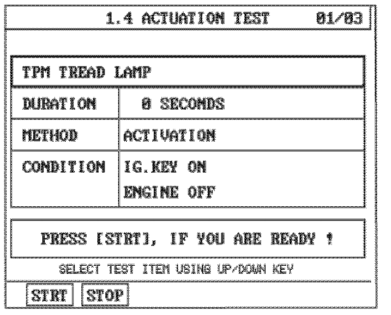 The ACTUATION TEST screen is used to test the function of the TPMS warning lamps. The F1 and F2 keys are used to START and STOP the tests.