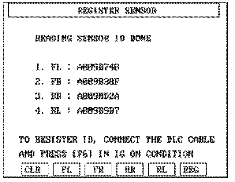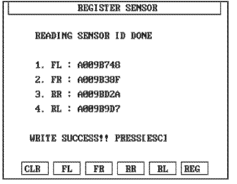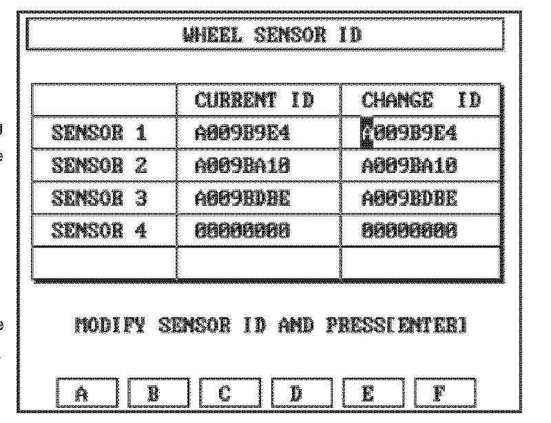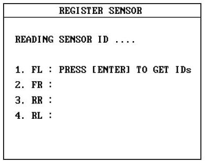 The WHEEL SENSOR ID screen is used as an alternate method to configuring sensor ID's. The primary method is to use the REGISTER SENSOR function.